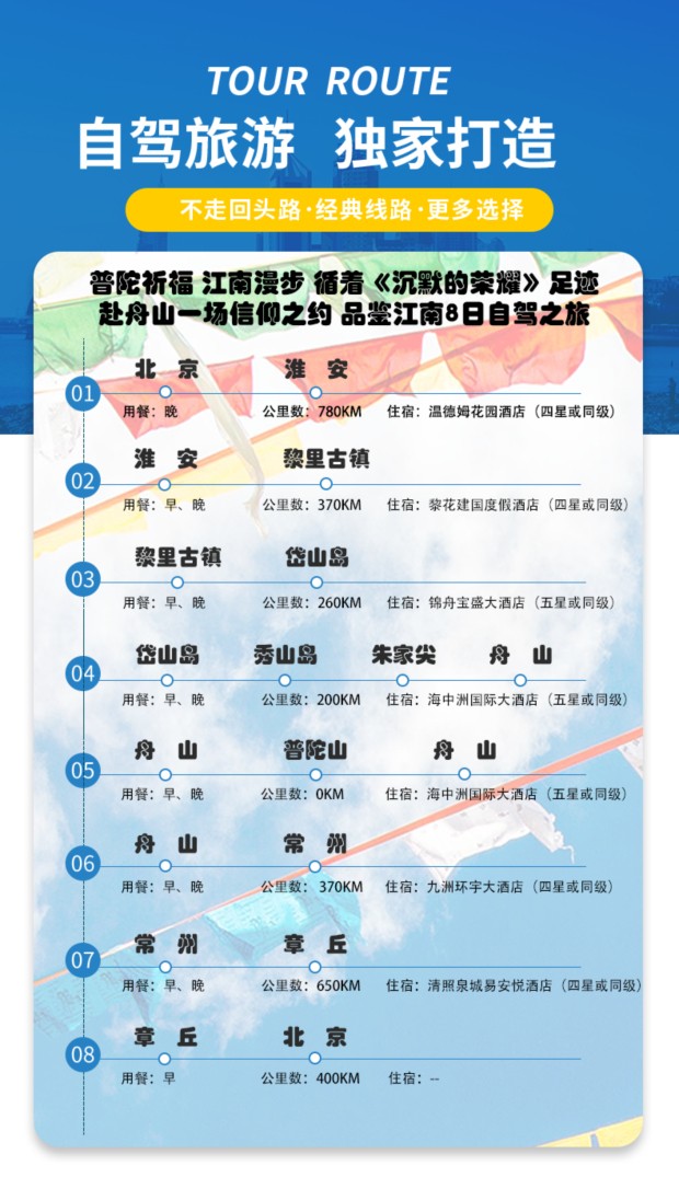 # 北京出发8日江南海岛+古城自驾之旅(全程3050km) ✅团期:2025.12.27 北京起止 历时8天 ✅招募价:4199元/人 | 单房差1400元/人 | 拼车费1500元/人 ✅适配车型:轿车/SUV/商务车 ✅核心保障:专业领航+4-5星酒店+高额保险+全程手台 --- ## 🔥行程亮点 ✅岱山岛|蓬莱仙岛!双合石壁悬崖栈道、东沙海边第一古镇、鹿栏晴沙铁板沙,台风/灯塔双博物馆,磨心山俯瞰千岛仙境 ✅舟山朱家尖|自驾大青山山海公路,览乌沙悬山云雾,打卡螺塘线沿海风光,狂炫海岛海鲜 ✅普陀山|海天佛国,中国佛教四大名山观音道场,沉浸式感受山海佛音秘境 ✅黎里古镇|小众江南水乡,百条弄堂藏古韵,辣鸡脚/油墩解馋,摇橹船听吴语小调+非遗手作 ✅常州青果巷+南市河|江南名士第一巷,毗邻京杭古运河,赏河抱古城水乡格局,品千年人文 ✅章丘明水古城|清照泉城核心,泉城相融北方园林,打卡百脉泉,必带章丘铁锅回家 --- ## 🚗详细行程(全程约3050km) 🔹DAY01 北京→淮安 780km|含晚餐|住淮安 早8:30京台高速G3万庄服务区集合,签到领物资→全天高速,傍晚到淮安入住+晚餐 🔹DAY02 淮安→黎里古镇 370km|含早/晚餐|住黎里古镇 早餐后出发→下午抵黎里古镇游览→晚餐后自由赏古镇夜景 🔹DAY03 黎里古镇→岱山岛 260km|含早/晚餐|住岱山岛 早餐出发,途经杭州湾/舟山/舟岱跨海高速→登岱山岛,沿海公路串游核心景点→入住晚餐 🔹DAY04 岱山岛→秀山岛→朱家尖→舟山 200km|含早/晚餐|住舟山 打卡秀山岛蓝白小镇→赴舟山逛螺塘线吃海鲜→午后自驾朱家尖山海公路,体验山海自驾乐趣→入住晚餐 🔹DAY05 舟山→普陀山→舟山|含早/晚餐|住舟山 早餐后乘船赴普陀山,全天自由逛海天佛国→按轮渡返程,酒店晚餐休整 🔹DAY06 舟山→常州 370km|含早/晚餐|住常州 早餐出发,经跨海/杭州湾大桥赴常州→入住后自由逛青果巷+南市河→酒店晚餐 🔹DAY07 常州→章丘 650km|含早/晚餐|住章丘 早餐返程,全天高速→下午抵章丘明水古城,游览北方园林→入住晚餐 🔹DAY08 章丘→北京 400km|含早餐 早餐后自由逛百脉泉/选购章丘铁锅→跟随指挥车返京或自行返程,圆满收官 --- ## ✨核心保障&专属增值福利 ✅专业自驾保障 ✅全程4-5星品质酒店,舒适休整 ✅10人以上配1-2名专业领队+1台领航车,全程护航 ✅每车1部手台(押金200元,无损退还) ✅赠专业高额自驾游保险 ✅含全程7早餐+7正餐,省心畅玩 ✅俱乐部专属增值(报名预约享) ✅通达远汽服:免费车辆检测 ✅北京五迈检测:价值300元机动车鉴定评估(四环内可上门) ✅京宠宠物:寄养8.5折+免费洗护1次,宠友无忧出行 --- ## 💰费用说明 ✅费用包含 1. 全程4-5星酒店标准间住宿 2. 全程7早7正餐(统一标准安排) 3. 行程内景点首道门票+舟山往返普陀山船票 4. 专业领队+领航车服务(10人以上) 5. 每车1部手台使用+专业自驾游保险 ❌费用不含 1. 景区内自费项目、酒店额外消费 2. 全程景点及酒店停车费 3. 手台押金200元(无损退)、单房差1400元/人 4. 自驾车油费、过路费,事故救援及维修费 --- ## 📌退改说明 1. 出发前10天以上退出,无损取消,全额退款 2. 出发前7-10天退出,扣除总费用20%(业务手续费) 3. 出发前4-7天退出,扣除总费用50%(订房订车费) 4. 出发前72小时内退出,全款不予退还 ✅报名咨询:专业自驾保障丨全程品质酒店丨深度玩转江南海岛古城